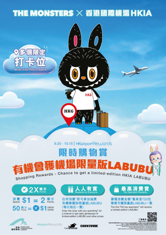 更有机会获得由龙家升先生特别为今次与香港国际机场的合作而设计的18厘米机场限量版Labubu手办,以香港国际机场标志性色彩设计,手持印有「HKG to Monster Land」的登机证,极具收藏与纪念价值。其他丰富奖品包括、特别为机场设计的《The Monsters》主题贴纸、雪糕礼券、HKairport Rewards机场奖赏积分以及HK$100 HKairportShop.com 网上商店优惠码。