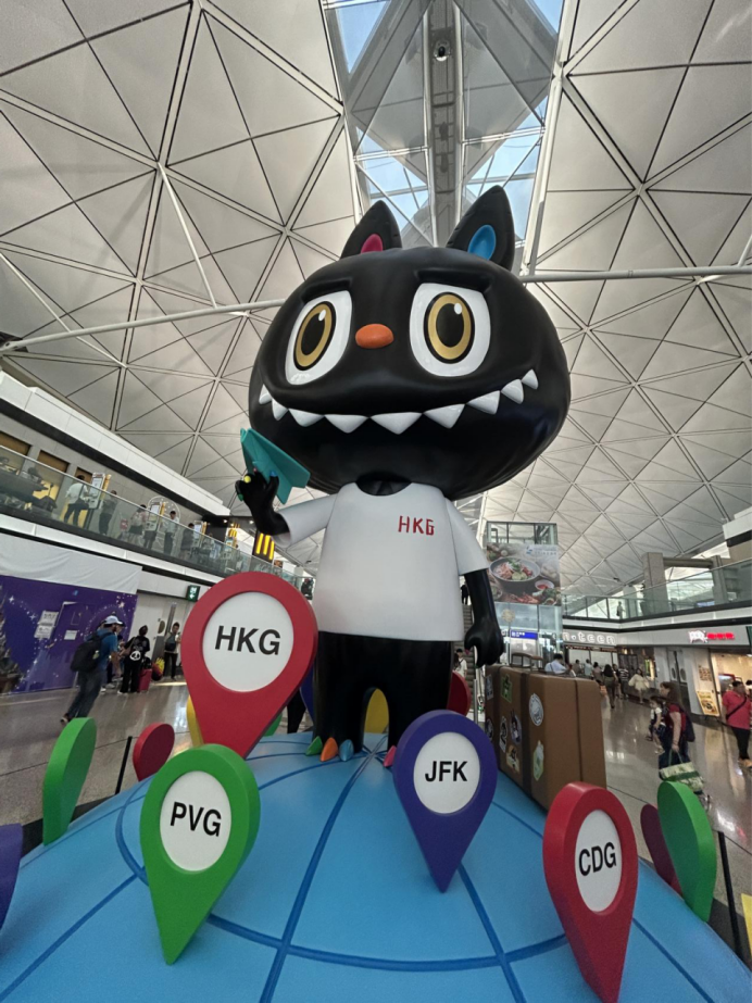 作为Labubu十周年世界巡展的首站,香港国际机场特别打造多处艺术打卡点。在离港层(L7)F行段后方(非禁区)设置高达7米的KING MON艺术装置,其手持纸飞机、身着“HKG”字样T恤的造型,寓意从香港飞向全球,让每一位亲眼目睹的旅客都为之震撼,纷纷驻足,用镜头记录下这份难忘的旅行记忆。展出至11月9日,喜欢潮玩的旅客一定不要错过了。